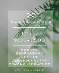 topics トピックス 2026/01/15 《営業時間変更のお知らせ》1/17(土)9:00~13:00(最終受付12:00)停電点検のため営業時間変更となりますご迷惑をおかけいたしますご理解の程宜しくお願い致します 2025/09/09 《臨時休業のお知らせ》9/13(土)~9/14(日)社員研修により休業となりますご迷惑をおかけいたしますご理解の程宜しくお願い致します 2025/07/25 《お盆営業時間のお知らせ》 8/12(火)~8/14(木)の期間は 営業時間を9:00~15:00と させていただきます (最終受付終了14:00) ※8/11(月)は休業日です ご了承の程 よろしくお願いします 2024/12/19 ・゜・。スクール開校・゜・。お待たせしました!これまでショートレッスンで実施していました『美姿勢エクササイズ』セミパーソナル的にお一人お一人に向き合い的確アドバイスを伝えながら自分に向き合う心地よい1時間を♥主な内容は❶姿勢チェック❷円運動❸青竹ビクス❹JSAボールエクササイズ❺体幹トレーニングと盛りだくさんです✨☑毎週水曜日 12:30~13:30☑メディカルフィットネスWINS スタジオにて☑料金¥1100 非会員¥1650☑予約制(0834-21-8181)姿勢を整え ー5歳の姿勢にご参加お待ちしています★ 2024/04/16 美姿勢エクササイズ👑プレミアム👑 イベントのお知らせ 4月からSTARTした《美姿勢エクササイズ》 を2倍に拡充したイベントを開催します♪姿勢は年齢を表すとも言われます。本来あるべき位置に身体をリセットし-5歳の姿勢を取り戻してみませんか?✔5/25㈯13:30~14:30✔多目的ルームにて✔会員¥550/非会員¥1,100お申込みは、TEL(0834-21-8181)またはQRコードからどうぞ皆様のご参加をお待ちしています担当 藤谷 2024/04/12 入会金・事務手数料 無料 キャンペーン 実 施 中4月限定入会金と事務手数料(¥5,500分)が無料 になるキャンペーンを実施中です!! この機会にWINSライフを始めてみませんか?(このキャンペーンでご入会された方は6月末まで休会・退会はできませんのでご注意ください) 2024/03/22 ✔毎回大好評BodyCare+の日程が決まりました外部 理学療法士のカウンセリングと施術が受けれる『BodyCare+』日程が決まりましたのでご連絡します!✔4/7㈰ ✔4/21㈰いずれも、時間は9:00、9:40、10:20、11:00、11:40、12:2013:00 (要予約)ですご予約をお待ちしています😊 2024/03/20 ◆お知らせ◆ボディケア料金の改定についていつもボディケアをご利用いただき誠にありがとうございます。令和6年4月より下記のように料金の改定をさせていただきます。ご理解の程、宜しくお願い致します。 2023/12/28 ❖営業時間変更のお知らせ❖いつもWINSをご利用頂きありがとうございます計画停電の為、以下のように営業時間を変更させて頂きます。1/13(土)9:00~17:00 ↓9:00~14:00(最終受付~13:00)ご迷惑をお掛け致しますがご理解ご協力の程よろしくお願いします。 2023/12/14 ❖避難訓練のお知らせ❖いつもWINSをご利用頂きありがとうございます21日正午からWINSにて避難訓練を実施いたします。実施時は、警報機が作動します。避難にご協力頂ける方は、ご協力をよろしくお願いします。ご迷惑をお掛けしますが、よろしくお願いします。